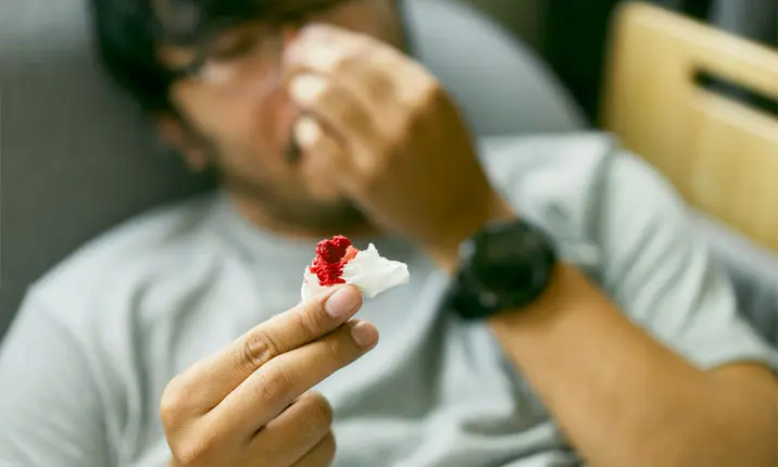 - Blood-stained phlegm from the nose and throat
