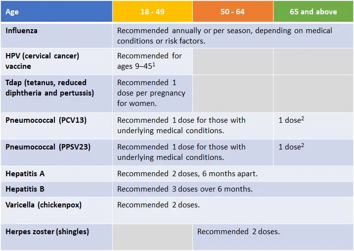 1 HPV-2 and HPV-4 vaccinations are recommended for ages 9 – 2, while HPV-9 can be given from 9 – 45 years old. 2 Pneumococcal vaccination for adults aged 65 and above includes PCV 13, followed by PPSV23 one year later.