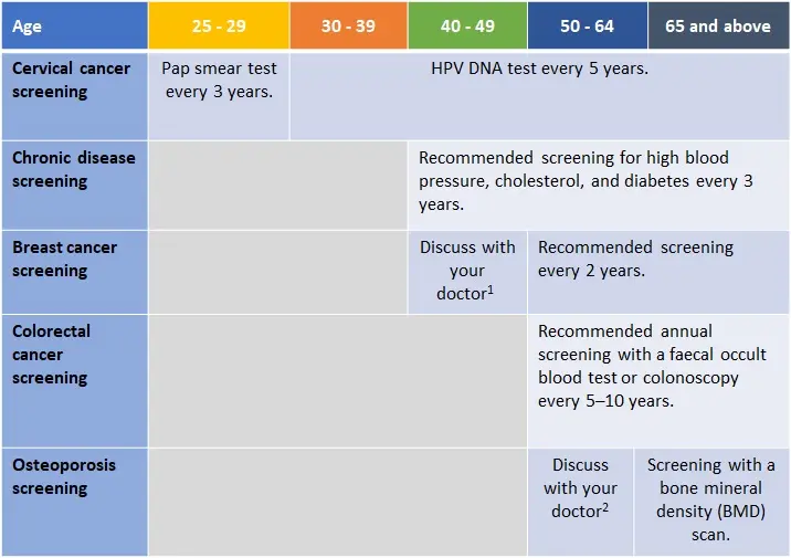 1 For women aged 40–49 years old, discuss with your doctor the benefits and limitations of a mammogram at this age. If recommended, schedule a mammogram screening once a year. 2 Your doctor will assess your risk factors for osteoporosis and fractures. For post-menopausal women, the osteoporosis self-assessment tool (OSTA) may be used as part of the evaluation.