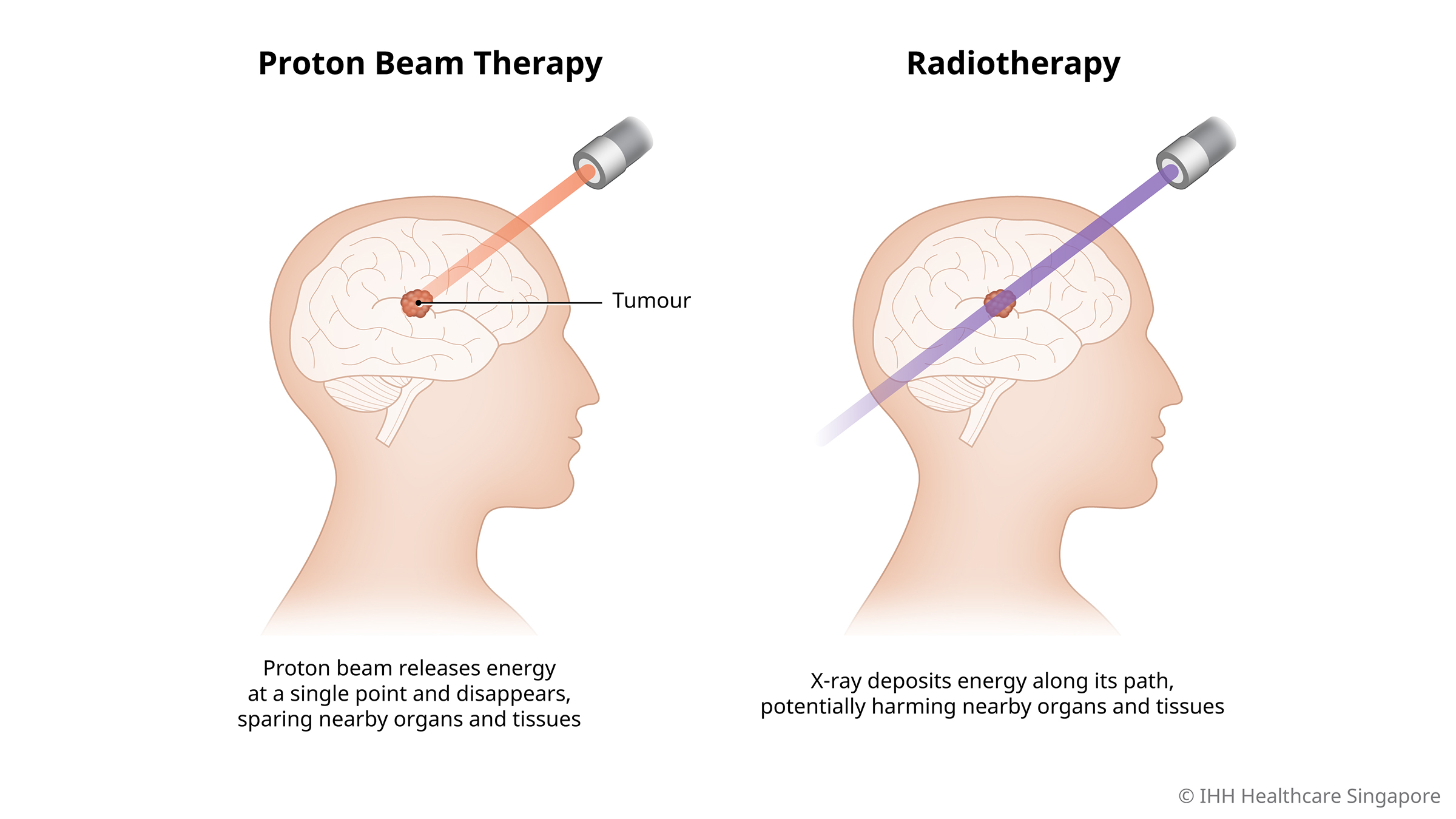 Proton beam therapy delivers less radiation outside of the tumour by directing a beam of proton particles that stops at the tumour, so the chances of damage to nearby healthy tissues are low.